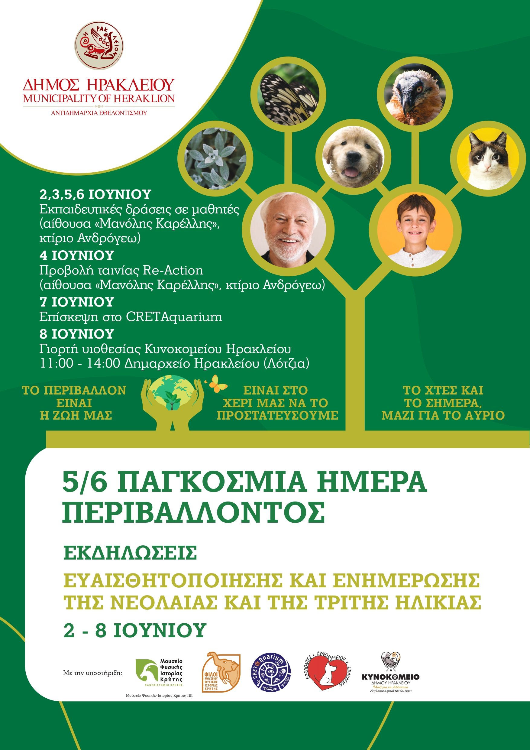 Δράσεις ενημέρωσης για τη νεολαία και την τρίτη ηλικία με θέμα «Περιβάλλον & Ζώα» διοργανώνει η Αντιδημαρχια Εθελοντισμού του Δήμου Ηρακλείου στο πλαίσιο της παγκόσμιας ημέρας Περιβάλλοντος από τη Δευτέρα 2 έως την Κυριακή 8 Ιουνίου.