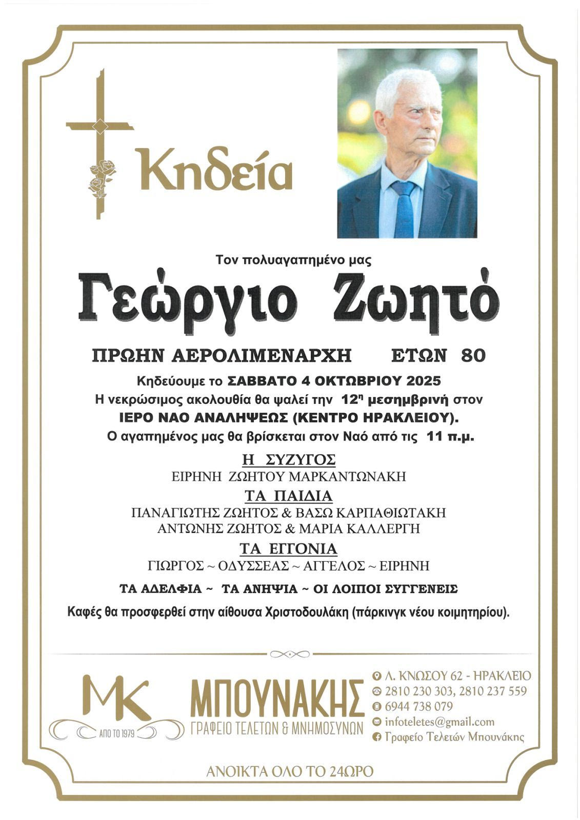 Θλίψη προκάλεσε στην τοπική κοινωνία ο θάνατος του πρώην αερολιμενάρχη Ηρακλείου Γεωργίου Ζωητού, ο οποίος έφυγε από τη ζωή σε ηλικία 80 ετών.