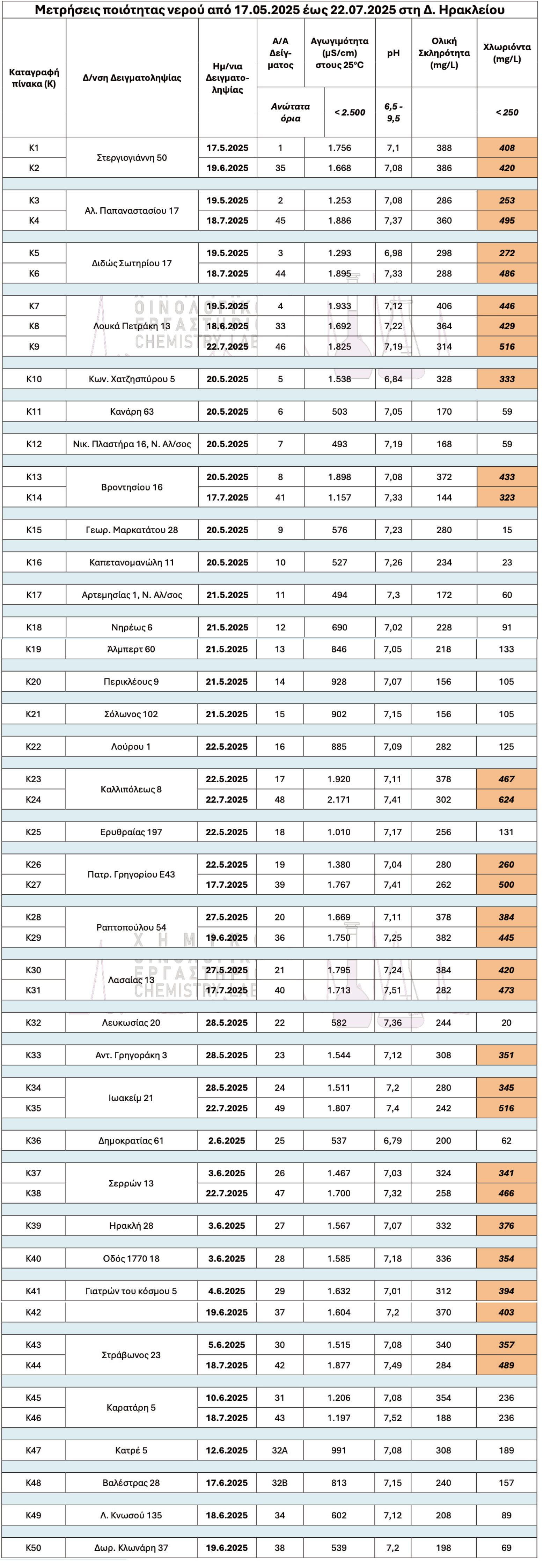 Σύμφωνα με τα αποτελέσματα των χημικών αναλύσεων, προέκυψε ότι δείγματα από πολλές περιοχές και συγκεκριμένα 31 από τα 50 αναλυόμενα, που καλύπτουν πάνω από το 40% της πόλης του Ηρακλείου πληθυσμιακά, εμφανίζουν τιμές χλωριούχων εκτός των επιτρεπόμενων ορίων, με αποκλίσεις από 30%, 50%, υπερβαίνοντας ακόμη και το 100% του ανώτατου αποδεκτού ορίου.