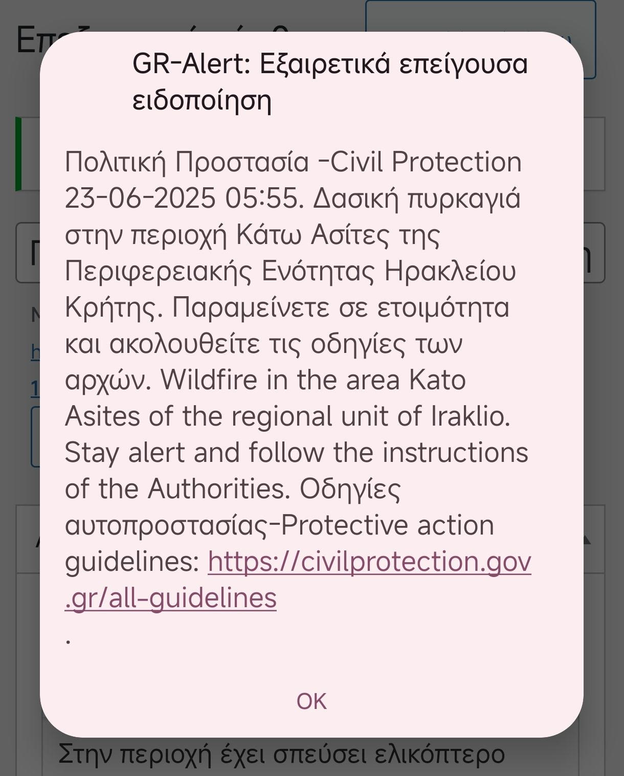 Μήνυμα στάλθηκε από το 112, λίγα λεπτά πριν τις 6 το πρωί της Δευτέρας, στην ευρύτερη περιοχή της δημοτικής ενότητας Γοργολαΐνη του Δήμου Ηρακλείου, με επίκεντρο την τοπική κοινότητα των Κάτω Ασιτών, λόγω πυρκαγιάς που μαίνεται στην περιοχή.