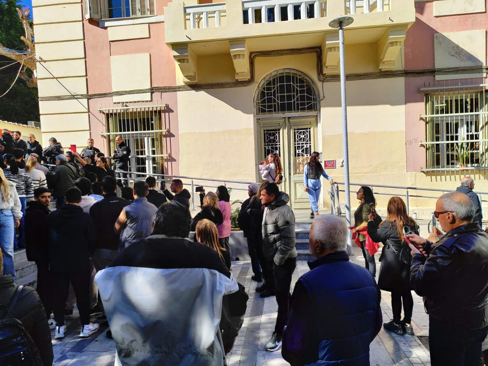 Ισχυρές αστυνομικές δυνάμεις βρίσκονται μέσα και έξω από το κτήριο, προσπαθώντας να αποτρέψουν τα επεισόδια και να μην επιτρέψουν στον κόσμο να τους πλησιάσει.
