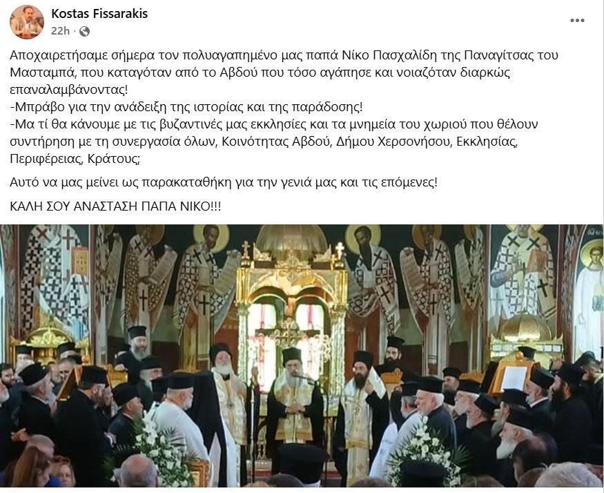 Πλήθος κόσμου συμμετείχε στο “στερνό αντίο” ενός ανθρώπου φωτεινού και ξεχωριστού του π.Nικολάου Πασχαλίδη, με την νεκρώσιμη ακολουθία να γίνεται στη “δική του” εκκλησία στην Παναγίτσα Μασταμπά.
