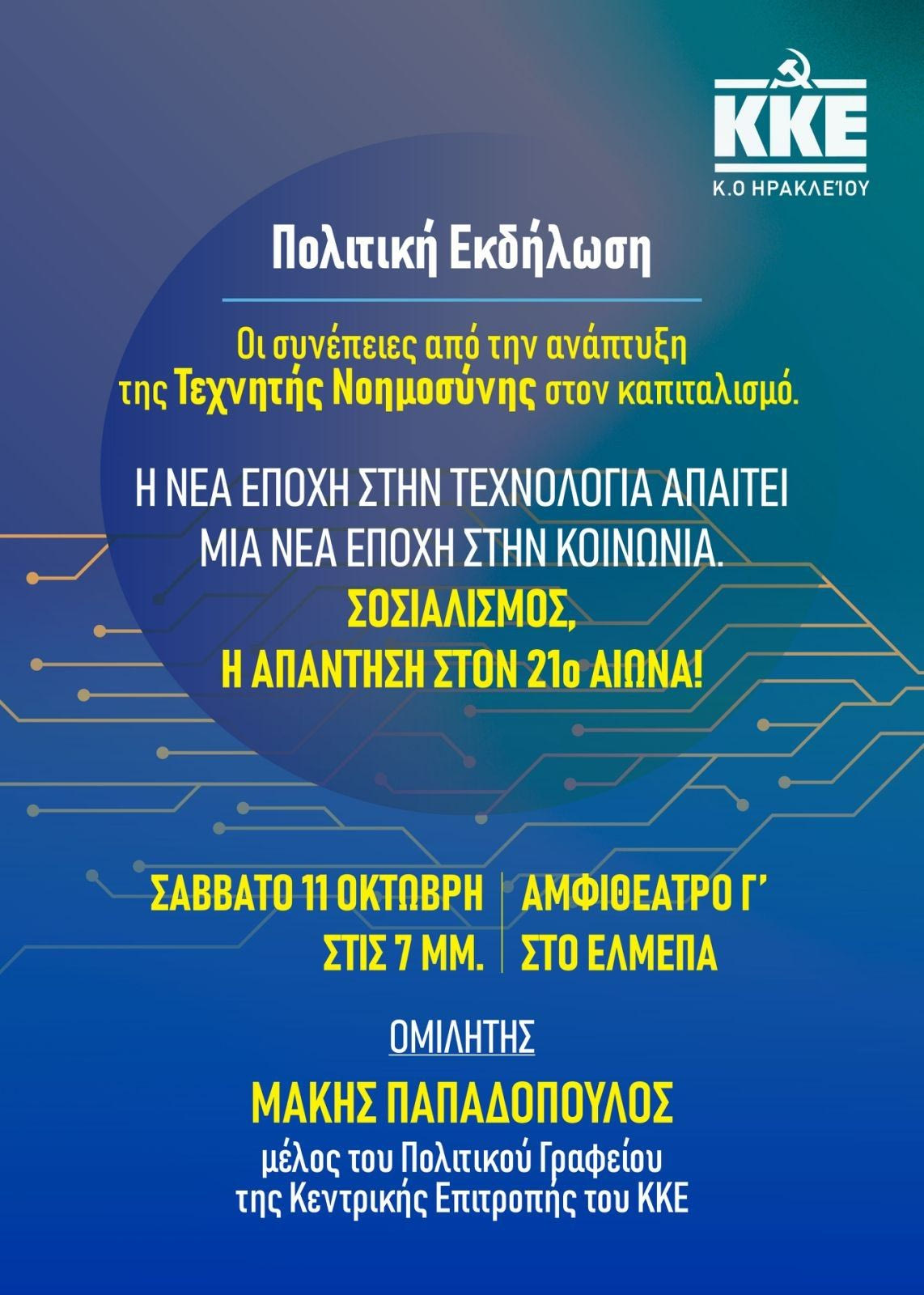 Η Τομεακή Επιτροπή Ηρακλείου του ΚΚΕ διοργανώνει Πολιτική Εκδήλωση το Σάββατο 11 Οκτωβρίου, ώρα 7:00μμ, στο Αμφιθέατρο Γ’ του ΕΛΜΕΠΑ με θέμα : «Οι συνέπειες από την ανάπτυξη της Τεχνητής Νοημοσύνης στον καπιταλισμό. Η νέα εποχή στην Τεχνολογία απαιτεί μία νέα εποχή στην κοινωνία. Σοσιαλισμός, η απάντηση στον 21ο αιώνα!».