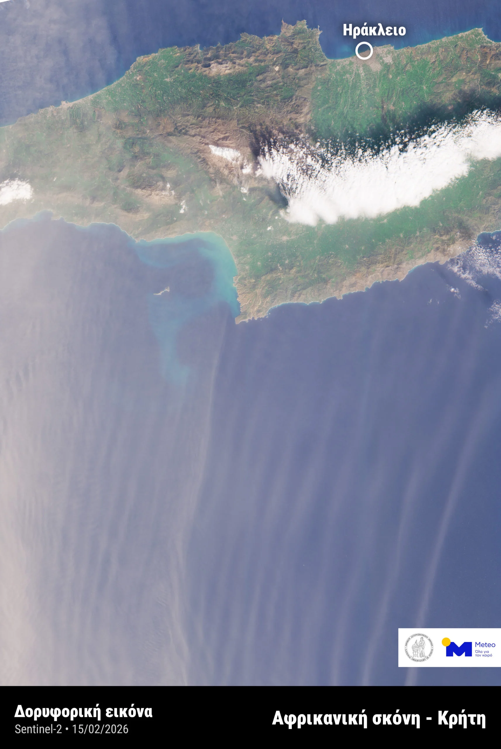 Η μονάδα METEO του Εθνικού Αστεροσκοπείου Αθηνών παρουσίασε δορυφορικές εικόνες που αποτυπώνουν το έντονο κύμα αφρικανικής σκόνης το οποίο επηρέασε την Ελλάδα και κυρίως την Κρήτη την Κυριακή 15 Φεβρουαρίου 2026. Το φαινόμενο αύξησε σημαντικά τις συγκεντρώσεις αιωρούμενων σωματιδίων (ppm) στην ατμόσφαιρα και επιβάρυνε την ποιότητα του αέρα. Οι εικόνες αναδεικνύουν την έκταση και την ένταση της μεταφοράς σκόνης προς τον ελλαδικό χώρο.