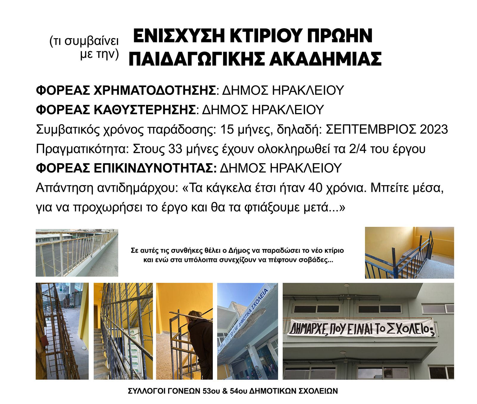 Φωνή απόγνωσης από τους γονείς των μαθητών του 53ου και 54ου Δημοτικών Σχολείων Ηρακλείου που στεγάζονται στο κτίριο της πρώην Παιδαγωγικής Ακαδημίας.