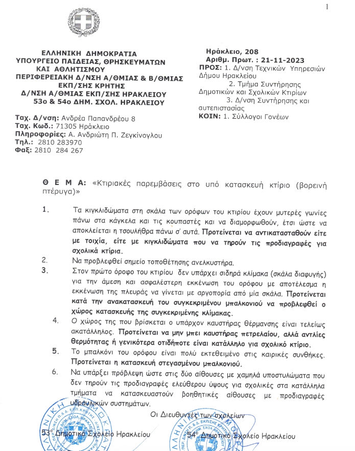 To έγγραφο προς τον Δήμο Ηρακλείου από τον Νοέμβριο του 2023, όπου επισημαίνονται τα συγκεκριμένα προβλήματα.