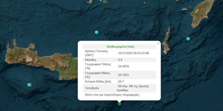 Ο σεισμός είχε επίκεντρο 56 Χλμ. ΝΑ της Χρυσής Λασιθίου και εστιακό βάθος στα 25 χιλιόμετρα.