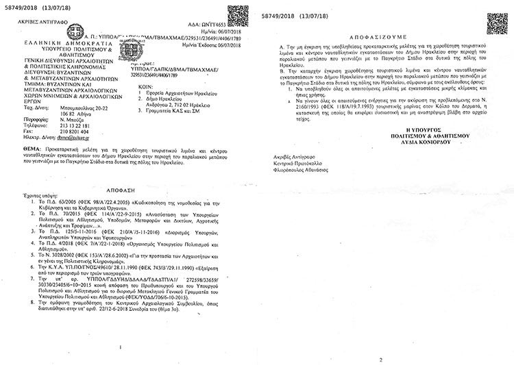 Το μεγάλο «ναι!» για τη δημιουργία μαρίνας στο Παγκρήτιο Στάδιο είπε το Κεντρικό Αρχαιολογικό Συμβούλιο. Η «Π» αποκαλύπτει το έγγραφο της απόφασης του ΚΑΣ το οποίο ανοίγει τον δρόμο για τη χωροθέτηση της μεγάλης τουριστικής υποδομής που εφόσον δρομολογηθεί αναμένεται να αλλάξει το προφίλ του δυτικού παραλιακού μετώπου της πόλης. Ωστόσο στην απόφασή του το ΚΑΣ δεν εγκρίνει την προκαταρκτική μελέτη την οποία κατέθεσε ο Δήμος Ηρακλείου όταν υπέβαλε το αίτημα της χωροθέτησης της μαρίνας στο Παγκρήτιο, κάτι που φαίνεται ότι δεν προβληματίζει ιδιαίτερα τη Λότζια, αφού πρόκειται για μια πρωτόλεια πρόταση που εύκολα μπορεί να επαναδιατυπωθεί με διαφορετική προσέγγιση και εναλλακτικούς όρους.