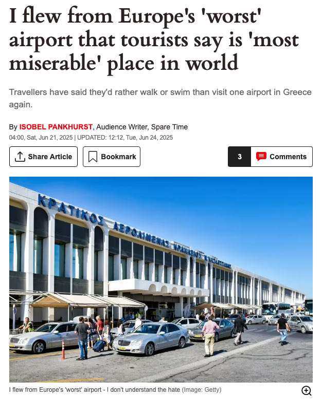Κόντρα στη βροχή των αρνητικών σχολίων για το αεροδρόμιο Ηρακλείου, μια Βρετανίδα δίνει διαφορετική οπτική. Τα θυμωμένα και εξευτελιστικά σχόλια κατακλύζουν τις κριτικές στις ταξιδιωτικές πλατφόρμες και τα κοινωνικά δίκτυα και περιγράφουν το “Νίκος Καζαντζάκης” με τα μελανότερα. χρώματα. Πολλοί μάλιστα φτάνουν να το χαρακτηρίζουν με ευκολία “το χειρότερο αεροδρόμιο στον κόσμο”. Τα περισσότερα από αυτά είναι ανακριβή και υπερβολικά σύμφωνα με την Βρετανίδα αρθρογράφο Ίζομπελ Πάνκχερστ.