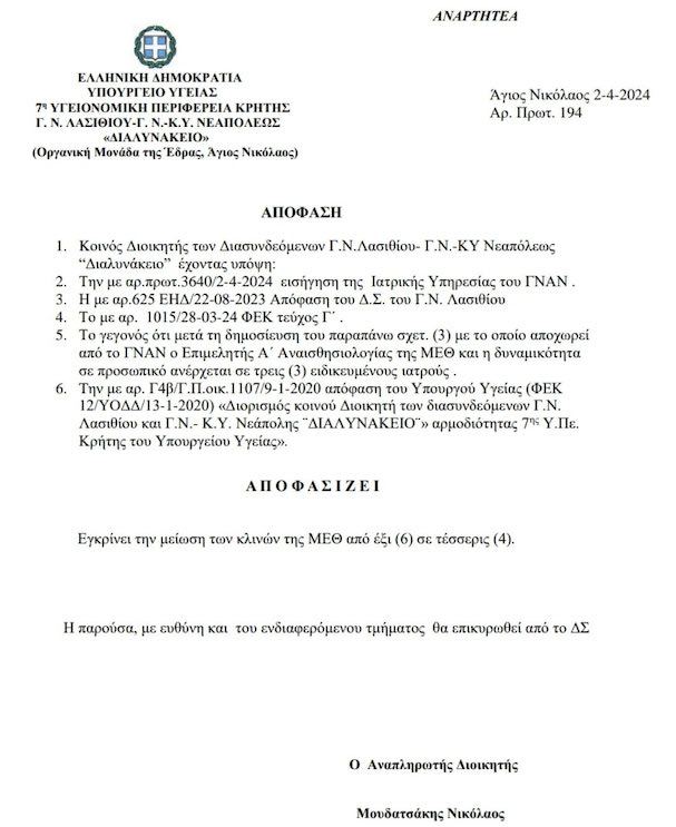 Η πρόσληψη ενός αναισθησιολόγου από το νοσοκομείο Αγίου Νικολάου στο Βενιζελειο,οδηγεί στο κλείσιμο 2 κλινών ΜΕΘ!