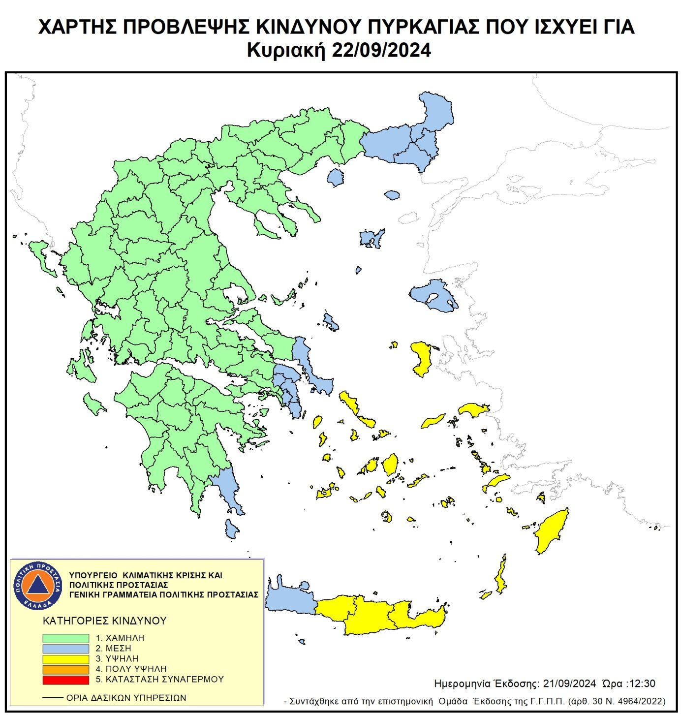 Σύμφωνα με τον Χάρτης Πρόβλεψης Κινδύνου στο κίτρινο βρίσκονται τρεις νομοί της Κρήτης και συγκεκριμένα οι νομοί: Ρεθύμνου, Ηρακλείου και Λασιθίου.