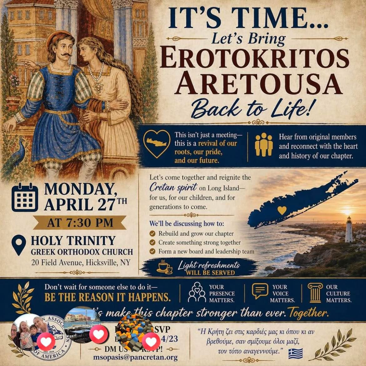 Ανοικτό κάλεσμα στον ελληνορθόδοξο ναό της Αγίας Τριάδας στο Χίξβιλ της Νέας Υόρκης, απευθύνουν Κρητικοί της περιοχής που προσπαθούν να επανιδρύσουν τον τοπικό Σύλλογο “Ερωτόκριτος – Αρετούσα”.