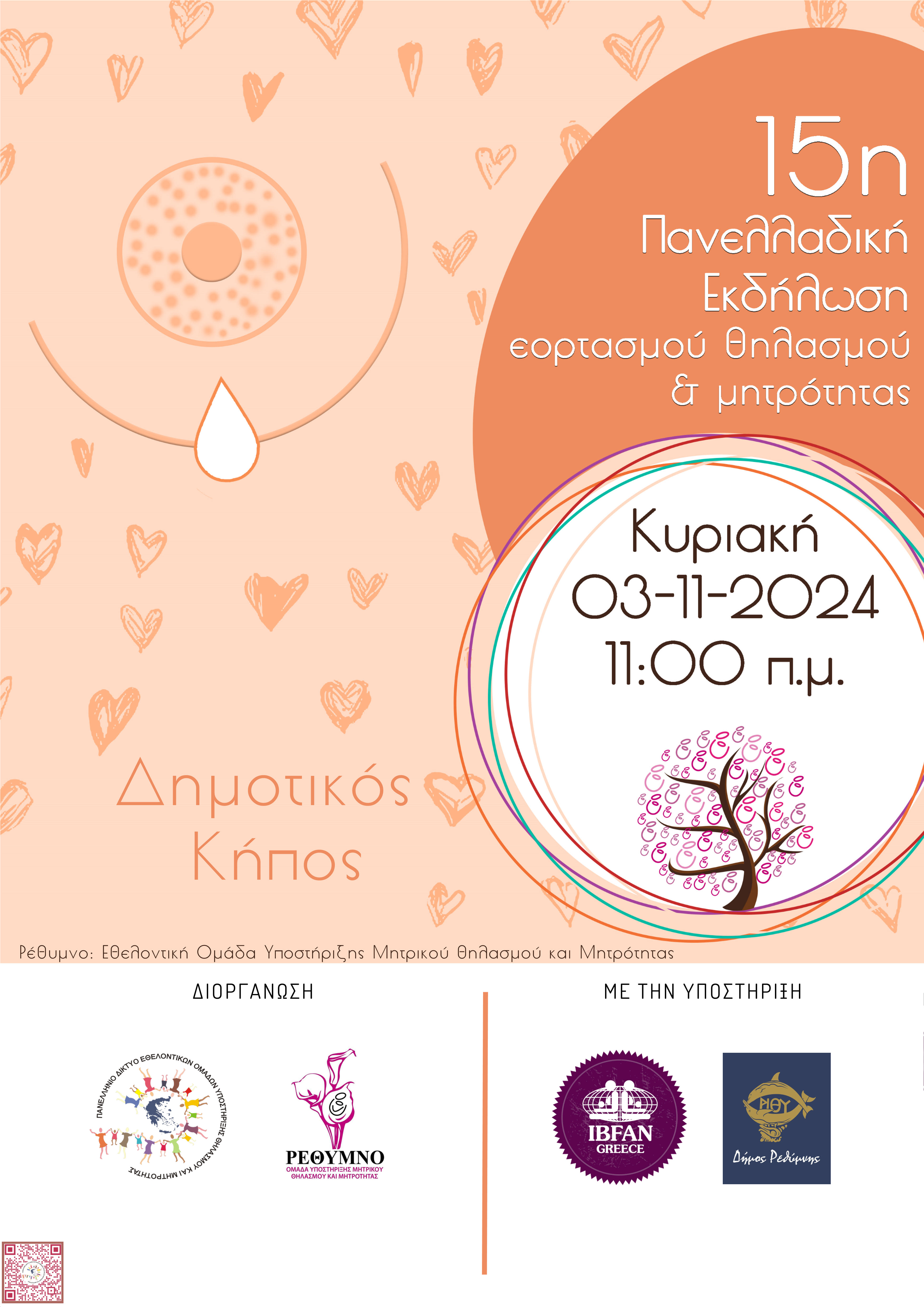 Στο πλαίσιο του εορτασμού της Παγκόσμιας Εβδομάδας Μητρικού Θηλασμού*, το Πανελλήνιο Δίκτυο Εθελοντικών Ομάδων Υποστήριξης Μητρικού Θηλασμού και Μητρότητας, διοργανώνει την 15η Πανελλαδική Εκδήλωση Εορτασμού Θηλασμού & Μητρότητας, πραγματοποιώντας εκδηλώσεις και συναντήσεις από άκρη σε άκρη στην Ελλάδα από 1 έως 7 Νοεμβρίου, δίνοντας με αυτόν τον τρόπο το παρών και αυτή τη χρονιά.