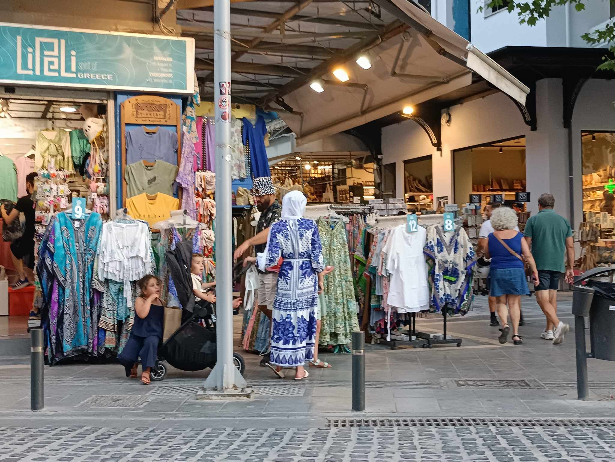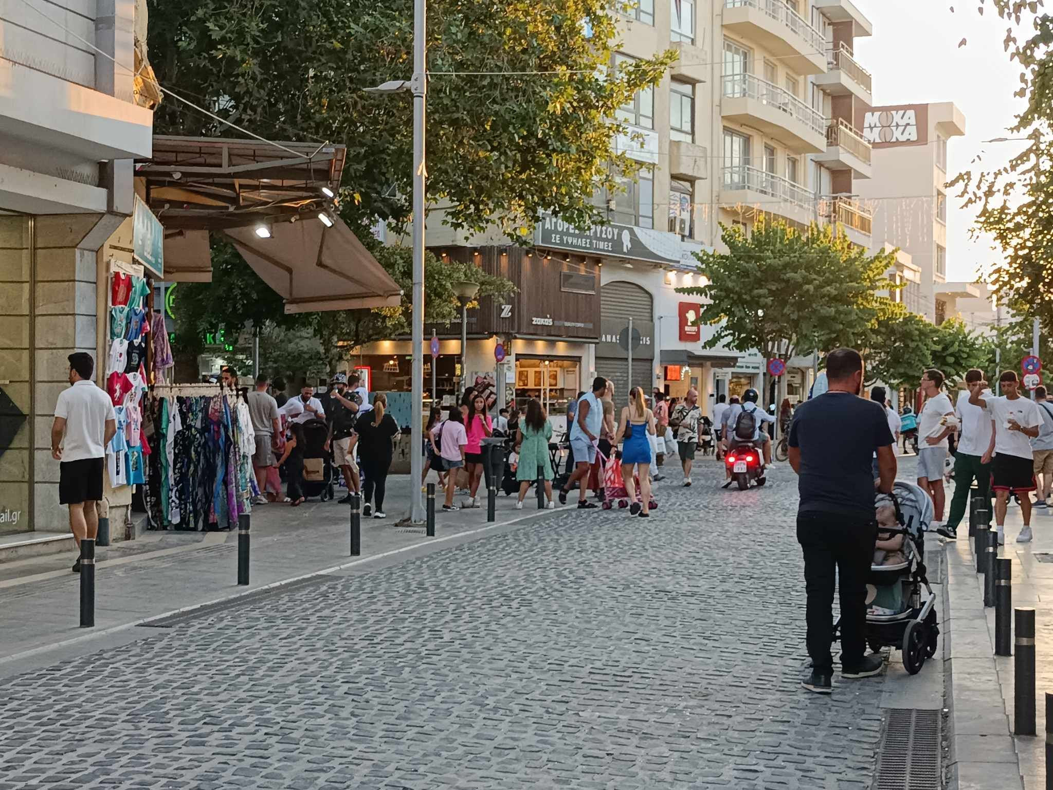 Το πολύβουο ανθρωπομελίσσι πάει και έρχεται, ντόπιοι και ξένοι, μπαίνουν στα μαγαζιά, τριγυρίζουν στους δρόμους , ψωνίζουν, κάθονται για καφεδάκι ή τρώνε ένα γρήγορο σνακ στα γρήγορα.