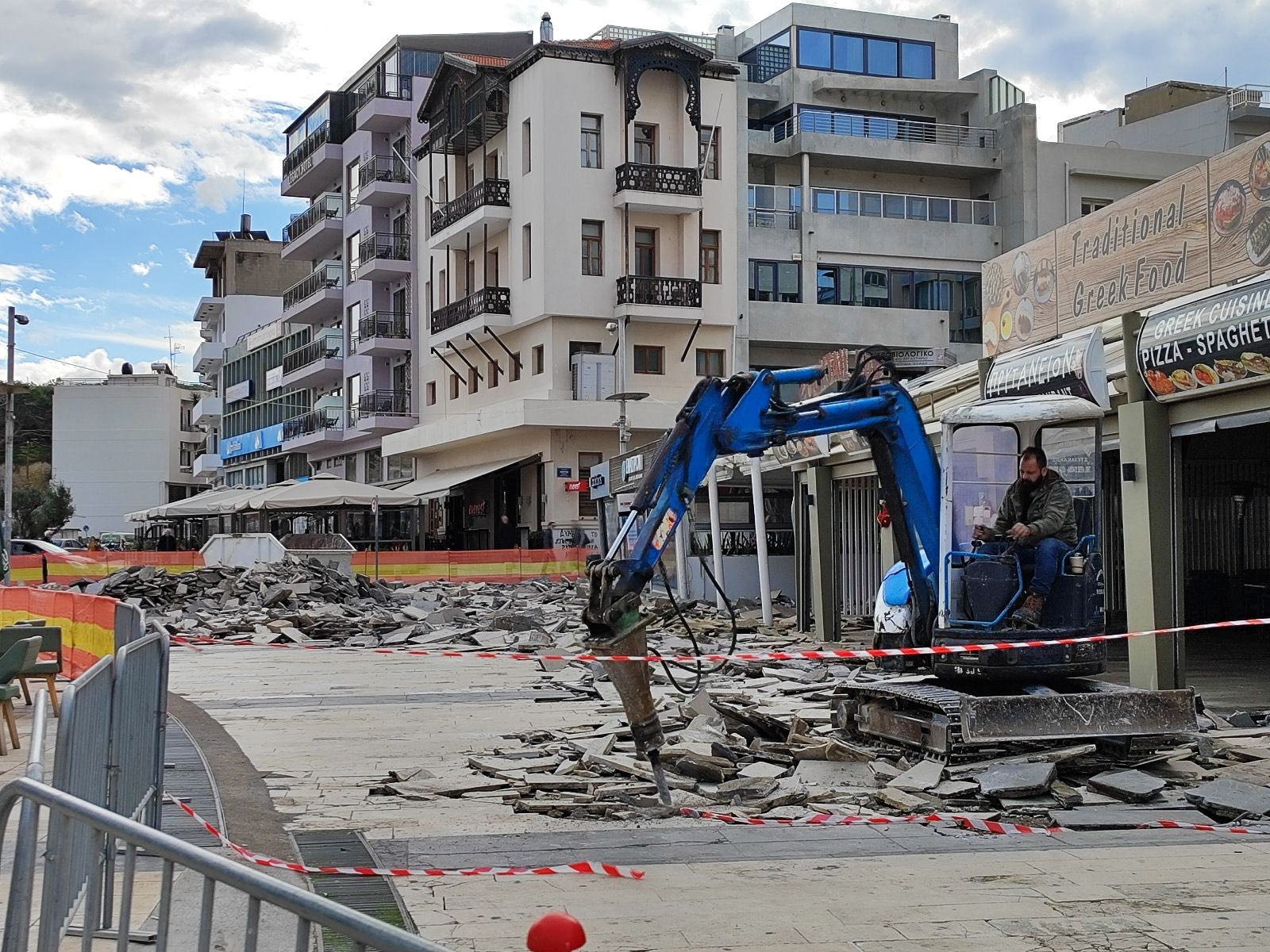 Σε πρώτη φάση καταστρέφονται οι πλάκες για να τοποθετηθούν τα καινούργια υλικά επίστρωσης. Το εργοτάξιο θα αναπτυχθεί και κάτω από το μεγάλο στέγαστρο όπου αναπτύσσονται τα τραπεζοκαθίσματα των καταστημάτων. Σε αυτό το τμήμα του εργοταξίου εκτιμάται ότι οι εργασίες θα εξελιχθούν πολύ γρήγορα, διότι δεν χρειάζεται να γίνουν εργασίες αντικατάστασης των δικτύων ύδρευσης αποχέτευσης και ομβρίων.