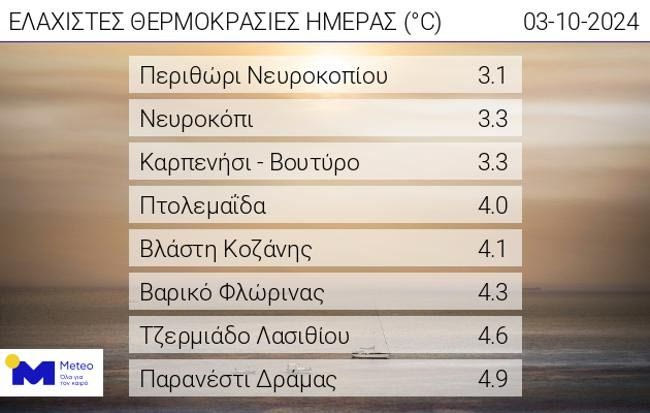 Η χαμηλότερη ελάχιστη καταγράφηκε στο Περιθώρι Νευροκοπίου, όπου ο υδράργυρος έπεσε στους 3,1 °C.