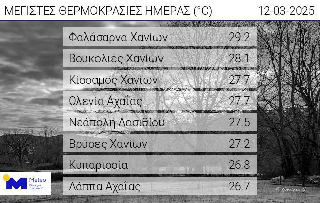 Σύμφωνα με τα στοιχεία του Εθνικού Αστεροσκοπείου Αθηνών/meteo.gr, η υψηλότερη θερμοκρασία καταγράφηκε σε περιοχές των Χανίων, όπως τα Φαλάσαρνα και οι Βουκολιές, όπου ο υδράργυρος έφτασε κοντά στους 30°C.