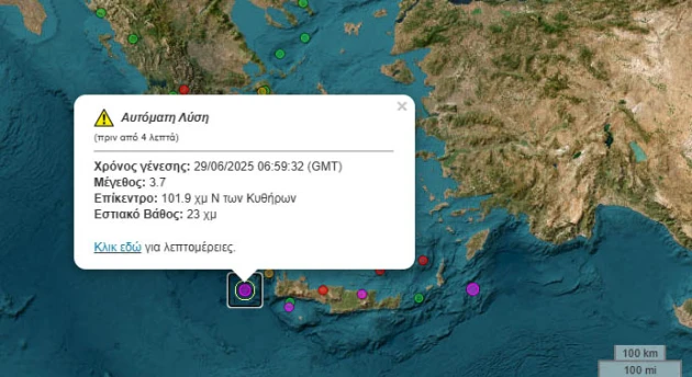 Λίγα λεπτά πριν τις 10 το πρωί, καταγράφηκε ακόμα μία σεισμική δόνηση της τάξης του 3,7 που έγινε αισθητή στον Νομό Χανίων. Το επίκεντρο ήταν 101χλμ. νότια των Κυθήρων και το εστιακό βάθος 23χλμ.