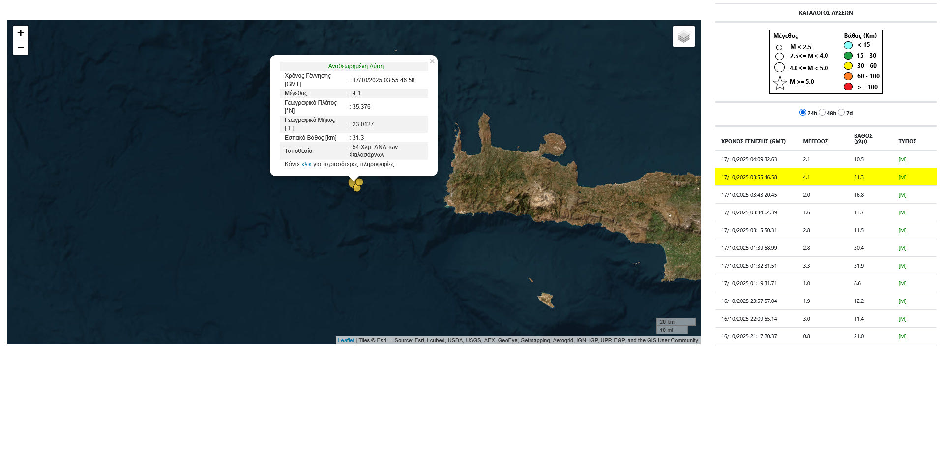 Σεισμική δόνηση 4,1 βαθμών της κλίμακας Ρίχτερ σημειώθηκε στις 06:55 το πρωί της Παρασκευής (17/10) σε απόσταση 290 χλμ. νότια της Αθήνας.