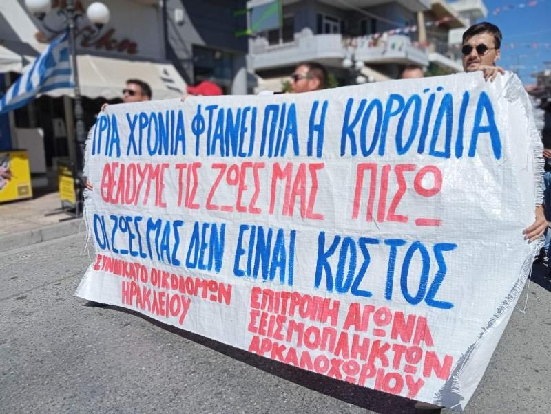 Σε πνεύμα μαχητικότητας πραγματοποιήθηκε η κινητοποίηση στο Αρκαλοχώρι, που οργάνωσαν το Συνδικάτο Οικοδόμων Ν. Ηρακλείου και η νεοσύστατη Επιτροπή Αγώνα Σεισμοπλήκτων Αρκαλοχωρίου, για τα 3 χρόνια από τον καταστροφικό σεισμό της 27ης Σεπτεμβρίου 2021 που έπληξε την περιοχή.
