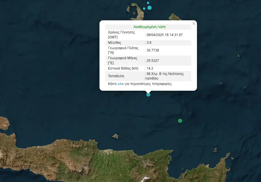 Σεισμός μεγέθους 3,6 βαθμών της κλίμακας Ρίχτερ σημειώθηκε στις 6:14 το απόγευμα (09.04.2025) ανοιχτά από το Λασίθι στην ανατολική Κρήτη.