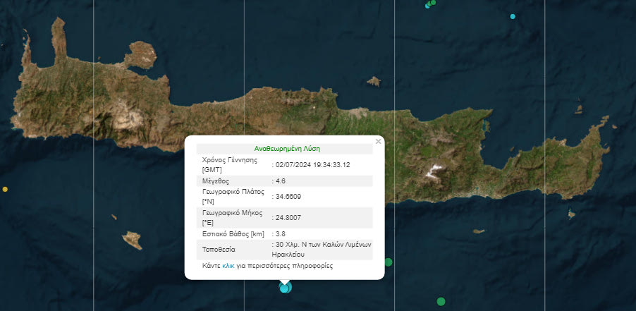 Κράτησε λίγα δευτερόλεπτα στις 10.34, όμως έγινε ιδιαίτερα αισθητή και στο Ηράκλειο, με επίκεντρο την θαλάσσια περιοχή νότια του νησιού, κοντά στο επίκεντρο του πρώτου ”κουνήματος” λίγο μετά τις 10.00 το βράδυ.