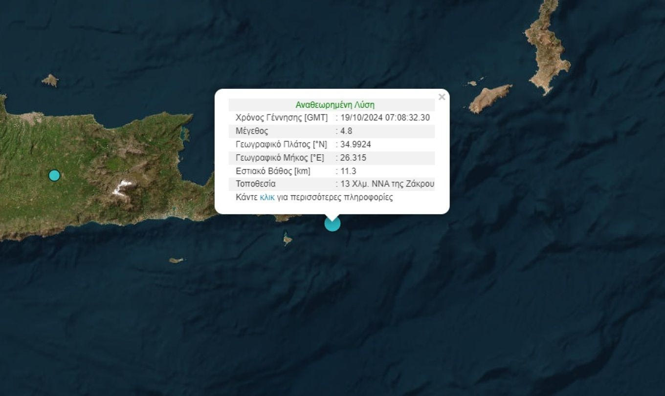 Σεισμός 4,8 Ρίχτερ σημειώθηκε νωρίς το πρωί του Σαββάτου στη θαλάσσια περιοχή ανοιχτά του Λασιθίου, στη νότια Κρήτη.