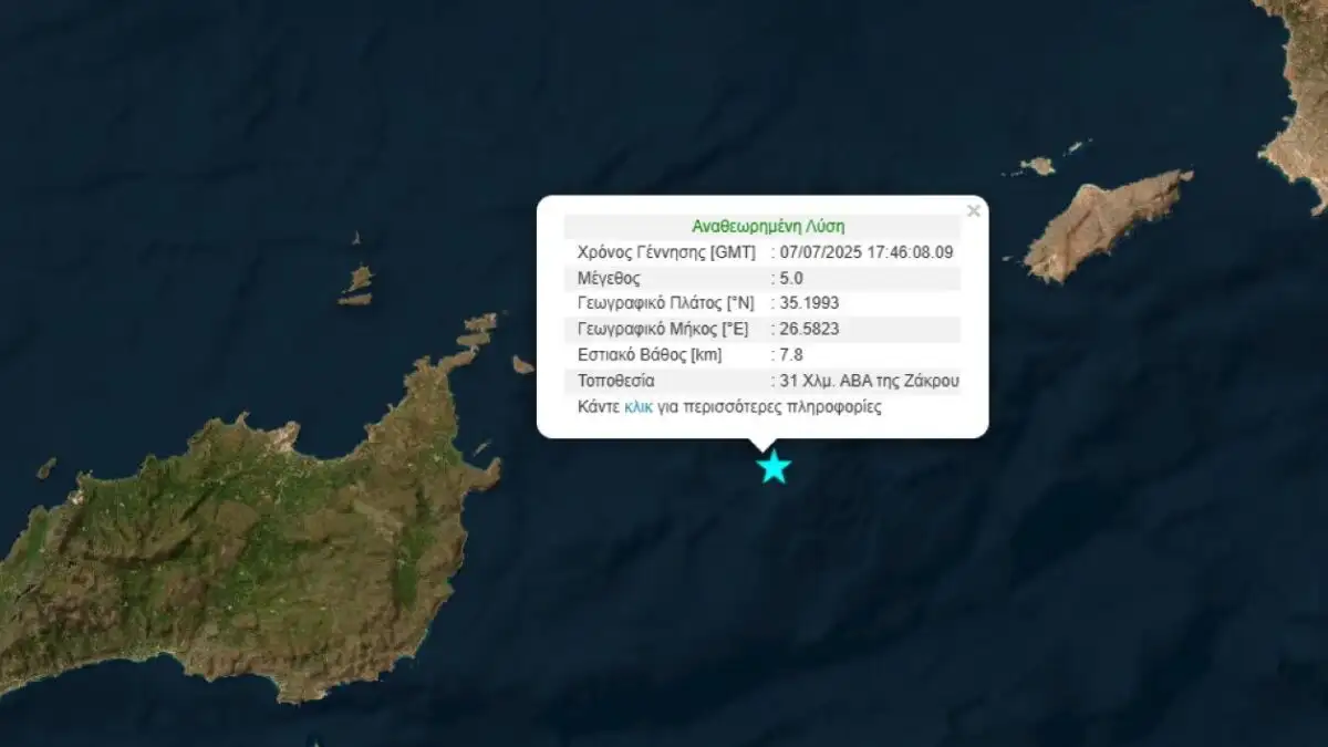 Το επίκεντρο του σεισμού εντοπίζεται στα 35 χιλιόμετρα ανατολικά – νοτιοανατολικά της Ζάκρου σύμφωνα με την αυτόματη λύση του Γεωδυναμικού Ινστιτούτου.