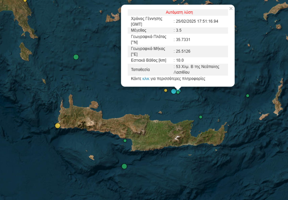 Σεισμική δόνηση 3,5 Ρίχτερ σημειώθηκε το απόγευμα της Τρίτης 25/2 ανοιχτά του Λασιθίου Κρήτης.