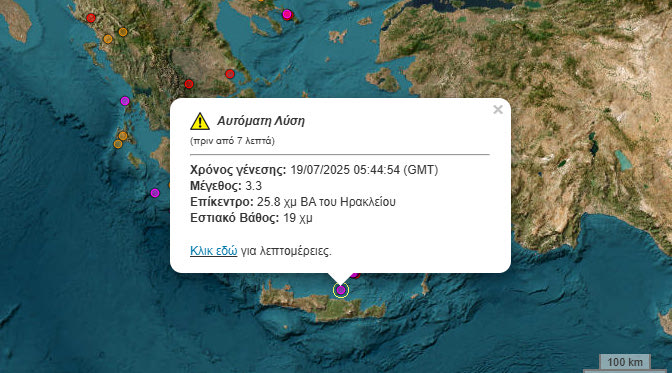 Σεισμός σημειώθηκε στις 8:44 το πρωί του Σαββάτου βόρεια- βορειοανατολικά του Ηρακλείου.