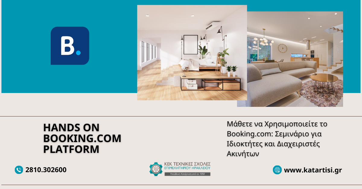 Ένα νέο σεμινάριο για όσους θέλουν να διερευνήσουν τις δυνατότητες χρήσης της Booking.com για τα ακίνητά τους διοργανώνει το ΚΕΚ Τεχνικές Σχολές Επιμελητηρίου Ηρακλείου.