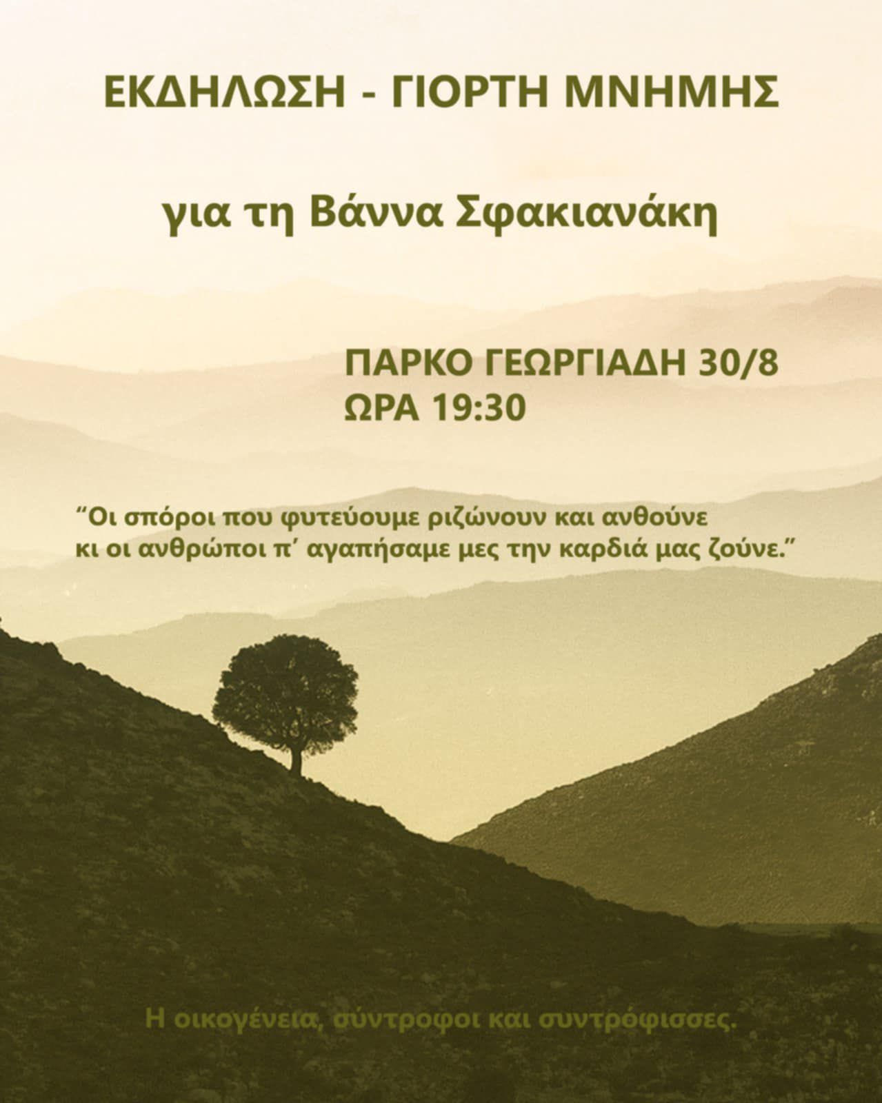 Το Σάββατο 30 Αυγούστου, στις 19:30μμ στο πάρκο Γεωργιάδη, θα πραγματοποιηθεί μία σεμνή γιορτή στη μνήμη της Βάννας Σφακιανάκη.