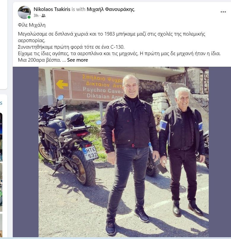 Ο Νίκος Τσακίρης αποχαιρετά με συγκίνηση τον φίλο του Μιχάλη Φανουράκη, που μαζί είχαν ξεκινήσει και την τελευταία βόλτα τους. Την μοιραία βόλτα που κατέληξε σε τραγωδία όταν ο Μιχάλης σκοτώθηκε με την μηχανή του στο Βουλισμένο αλώνι.