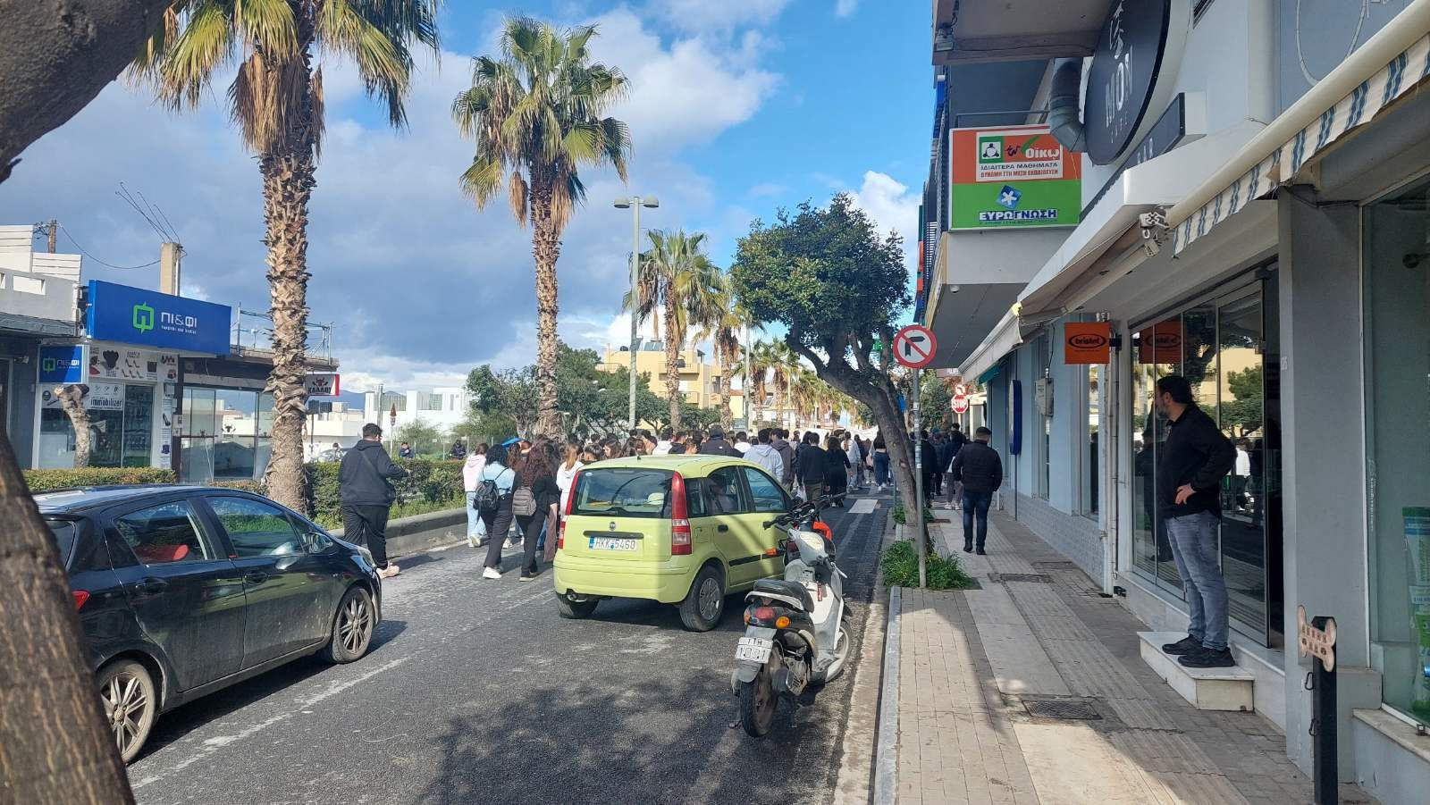 Κρατώντας πανό και φωνάζοντας συνθήματα πλήθος κόσμου βρίσκεται από τις 9 το πρωί της Παρασκευής στο κέντρο του Ηρακλείου, ενόψει του συλλαλητηρίου για τα δύο χρόνια από τα Τέμπη.