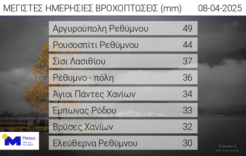 Όπως φαίνεται στο πίνακα όπου παρουσιάζονται οι 8 σταθμοί του δικτύου που κατέγραψαν τα μεγαλύτερα ύψη βροχής έως τις 18:00, 49 χιλιοστά βροχής καταγράφηκαν στην Αργυρούπολη Ρεθύμνου και ακολούθησαν το Ρουσισπίτι Ρεθύμνου (44 χιλιοστά) και το Σίσι Λασιθίου (37 χιλιοστά).