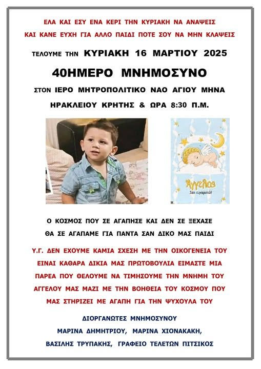 Και ενώ εκείνοι ρίχνουν το μπαλάκι ο ένας στον άλλο, οι πολίτες του Ηρακλείου προετοιμάζουν το μνημόσυνο του άτυχου παιδιού την Κυριακή 16 Μαρτίου στον Ιερό Μητροπολιτικό Ναό του Αγίου Μηνά, στις 8:30π.μ.