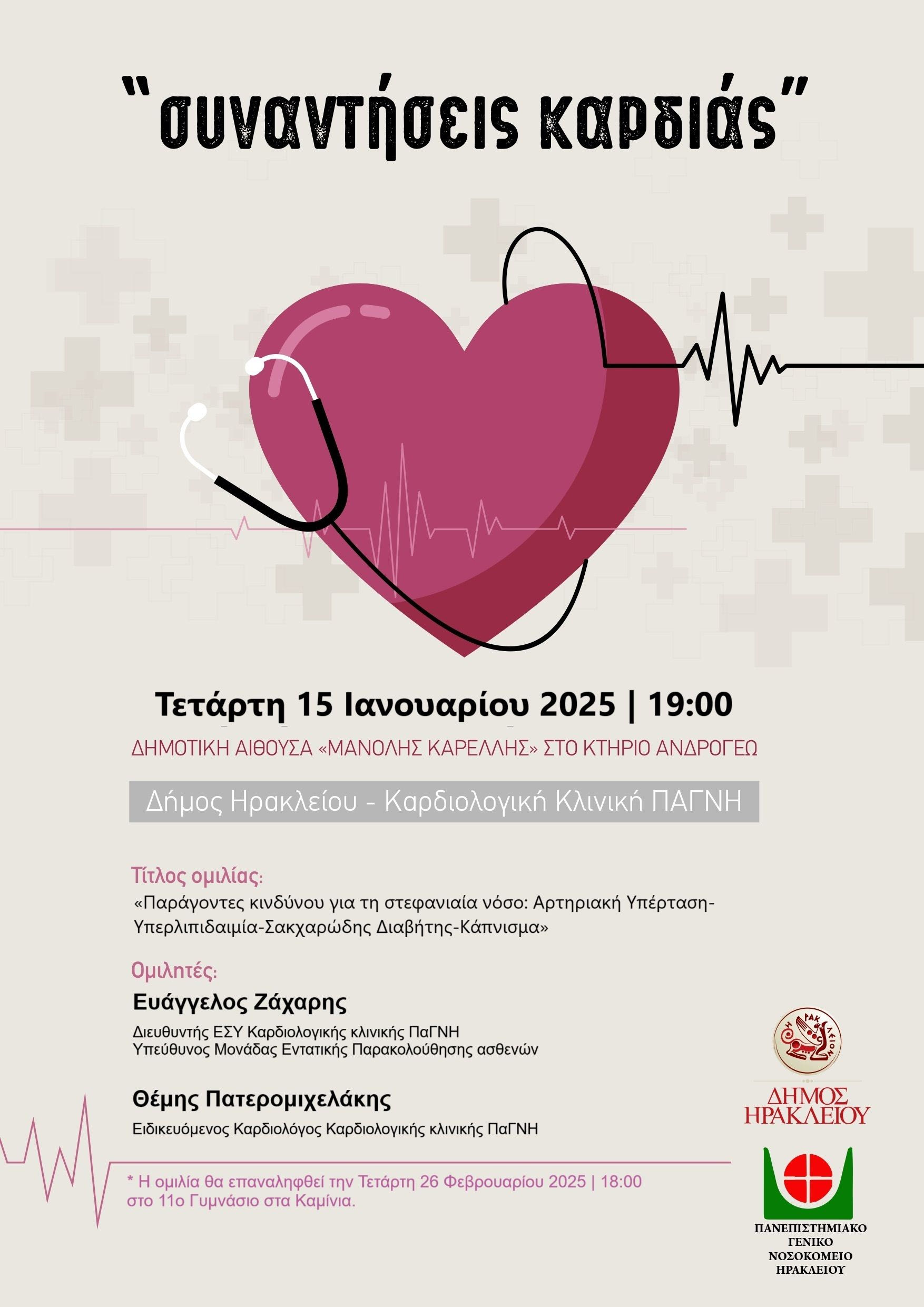 Υπενθυμίζεται ότι στις «Συναντήσεις Καρδιάς» που έχουν ως στόχο την πρόληψη και την ενημέρωση του κοινού γύρω από τα καρδιολογικά προβλήματα, διακεκριμένοι καρδιολόγοι προσφέρουν πολύτιμες πληροφορίες για την πρόληψη αλλά και για την καλύτερη αντιμετώπιση των καρδιολογικών νοσημάτων τα οποία αποτελούν την πρώτη αιτία θανάτου. Οι ομιλίες, με ελεύθερη συμμετοχή για το κοινό, θα πραγματοποιούνται μία φορά το μήνα εκ περιτροπής στο κέντρο του Ηρακλείου και στην περιφέρεια της πόλης.