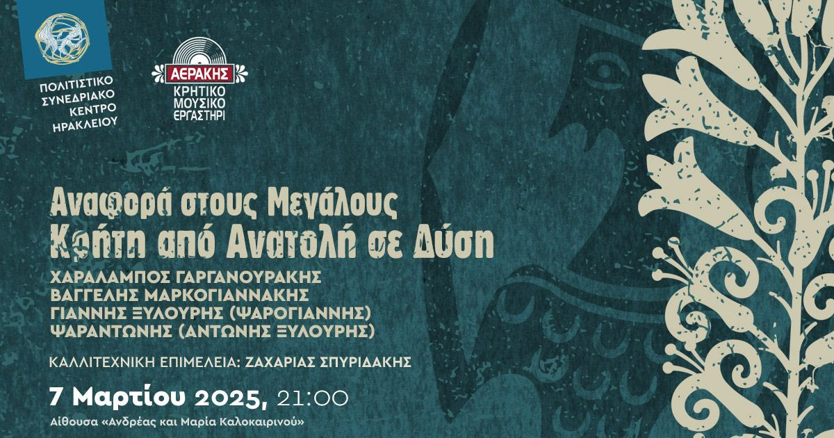 Την Παρασκευή 7 Μαρτίου, στο Πολιτιστικό Συνεδριακό Κέντρο Ηρακλείου, στις 21:00 στην Αίθουσα «Ανδρέας και Μαρία Καλοκαιρινού»