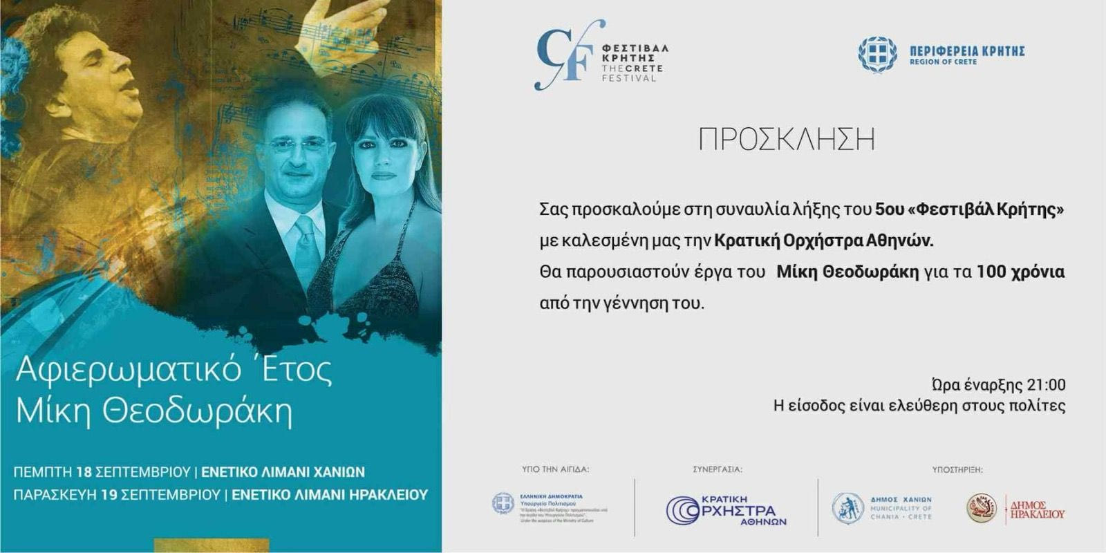 Η Κρατική Ορχήστρα Αθηνών συμμετέχει στο 5ο Φεστιβάλ Κρήτης διοργανώνοντας ένα αφιέρωμα στον Μίκη Θεοδωράκη, κλείνοντας το φεστιβάλ με μια κορυφαία εκδήλωση.