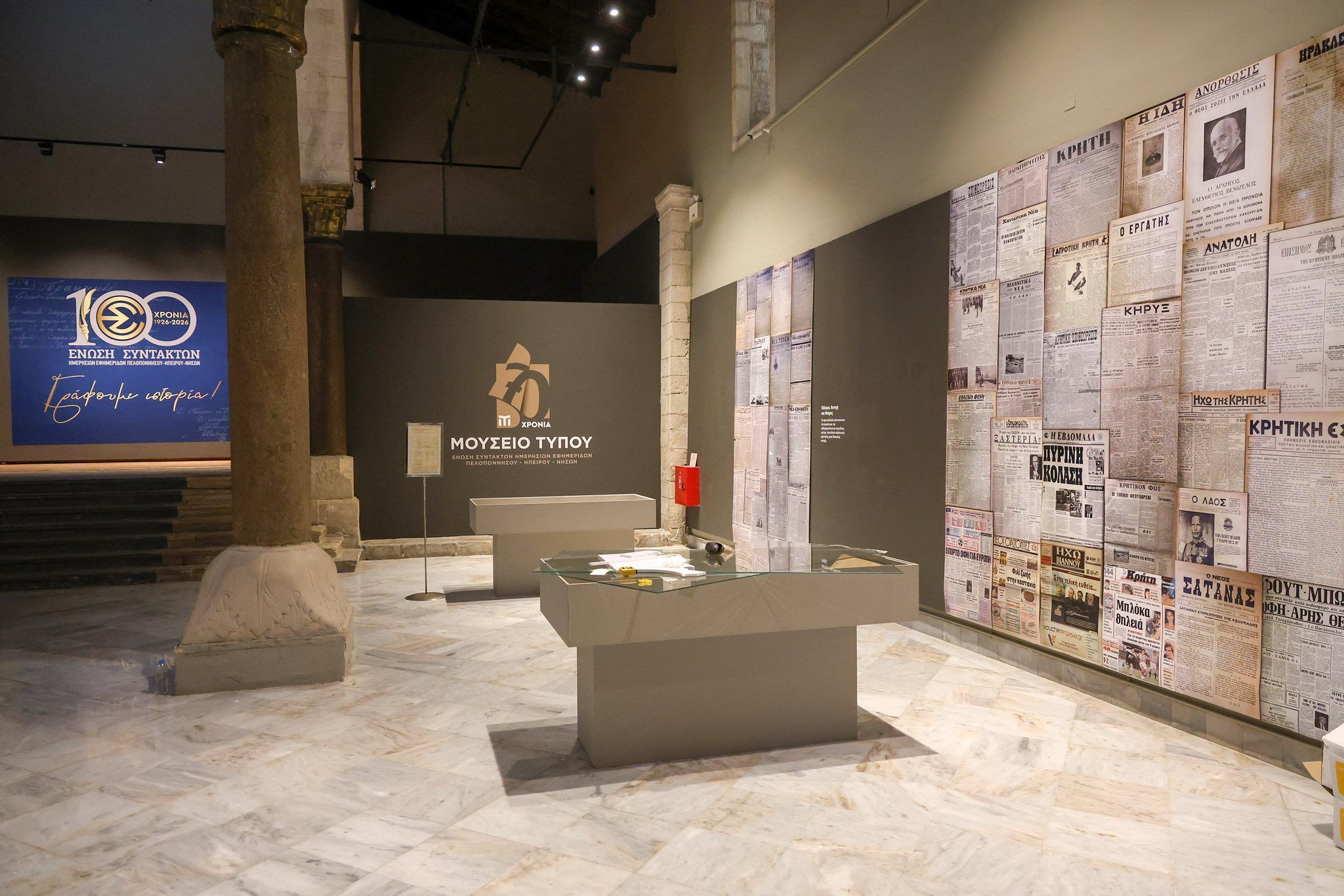 Η μεγαλύτερη γεωγραφικά δημοσιογραφική ένωση της χώρας, με αφορμή τη συμπλήρωση 100 ετών (1926-2026) από την ίδρυσή της, ξεκίνησε τις επετειακές της δράσεις από το Ηράκλειο, με τη στήριξη της Περιφέρειας Κρήτης και τη συμβολή του Δήμου Ηρακλείου με την έκθεση «Γράφουμε Ιστορία» στη Βασιλική του Αγίου Μάρκου (20-30 Μαρτίου 2026), όπου ξεναγήθηκε σήμερα ο Περιφερειάρχης Κρήτης από τον Πρόεδρο της ΕΣΗΕΠΗΝ Κυριάκο Κορτέση, παρουσία του Πρόεδρου του ΤΕΑΣ, μελών του Διοικητικού Συμβουλίου της Ένωσης, και του Μουσείου Τύπου.
