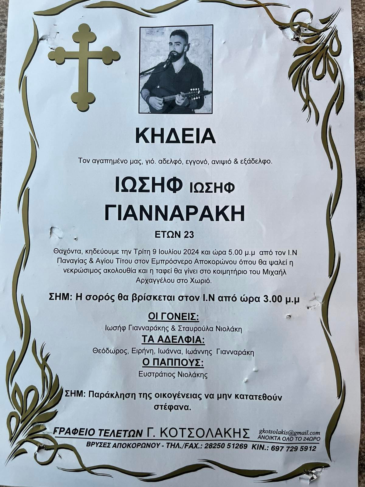 Σήμερα, στις 17.00 θα ψαλεί η νεκρώσιμος ακολουθία στον Ιερό Ναό Παναγίας και Αγίου Τίτου στον Εμπρόσνερο Αποκορώνου ενώ η ταφή θα γίνει στο κοιμητήριο του Μιχαήλ Αρχάγγελου.