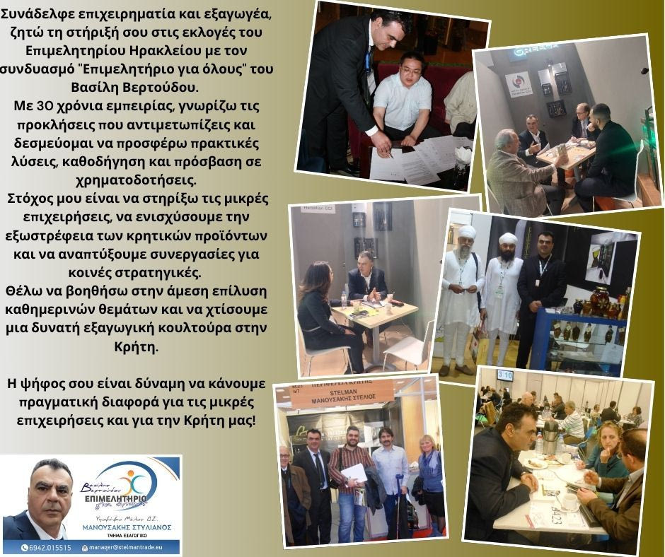 Tην υποψηφιότητά του στο Εξαγωγικό Τμήμα του Επιμελητηρίου Ηρακλείου στις επερχόμενες εκλογές, με το συνδυασμό του Βασίλη Βερτούδου “Επιμελητήριο για όλους”, ανακοίνωσε ο Στέλιος Μανουσάκης.