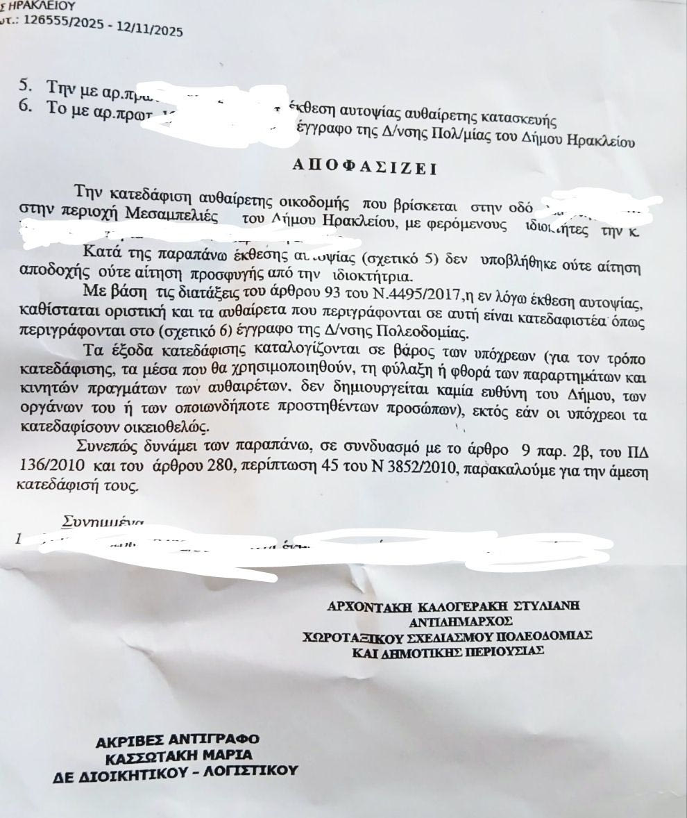 Σε απόλυτο σοκ βρίσκονται ιδιοκτήτες αυθαίρετων κτισμάτων, οι οποίοι παραλαμβάνουν ο ένας μετά τον άλλο, νέα μπιλιετάκια από την Πολεοδομία του Δήμου Ηρακλείου, από τα οποία προκύπτει ότι προχωρά η διαδικασία για την κατεδάφισή τους!