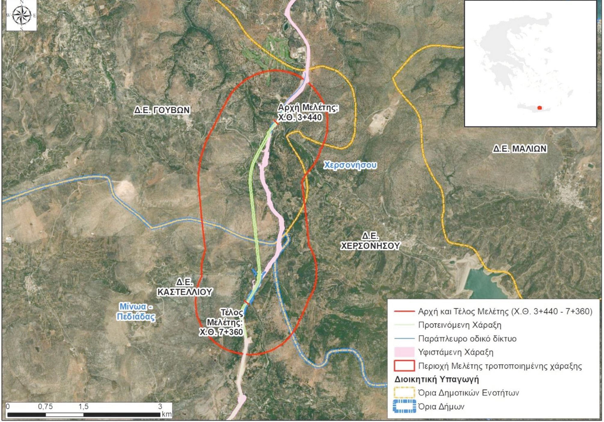 - Η αποκατάσταση κυκλοφορίας στην υφιστάμενη Ε.Ο. Χερσονήσου – Καστελλίου γίνεται με νέα χάραξη αριστερά του αυτοκινητοδρόμου από την Χ.Θ. 6+570 έως την Χ.Θ. 7+300.