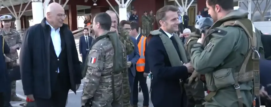 Ο υπουργός Άμυνας Νίκος Δένδιας υποδέχθηκε τον Γάλλο πρόεδρο θερμά.