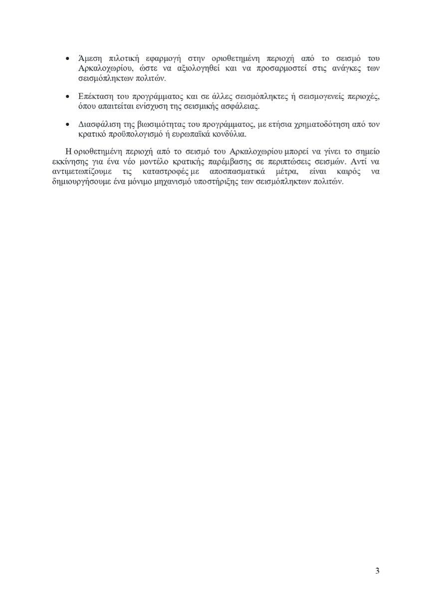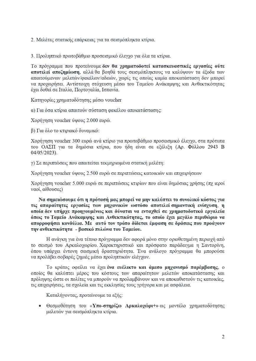 Με τη συγκεκριμένη επιστολή, τα μέλη του Συλλόγου «Η Ελπίδα» αναλύουν μια ουσιαστική πρόταση στήριξης των σεισμόπληκτων πολιτών, η οποία αφορά στην υλοποίηση ενός στοχευμένου προγράμματος χρηματοδότησης μελετών αποκατάστασης και ενίσχυσης της σεισμικής ασφάλειας των κτιρίων. Επισημαίνουν έτσι ότι η οριοθετημένη περιοχή από το σεισμό του Αρκαλοχωρίου, μπορεί να γίνει το σημείο εκκίνησης για ένα νέο μοντέλο κρατικής παρέμβασης σε περιπτώσεις σεισμών και τονίζουν ότι αντί να αντιμετωπίζονται οι καταστροφές με αποσπασματικά μέτρα, είναι καιρός να δημιουργηθεί ένας μόνιμος μηχανισμός υποστήριξης των σεισμόπληκτων πολιτών.