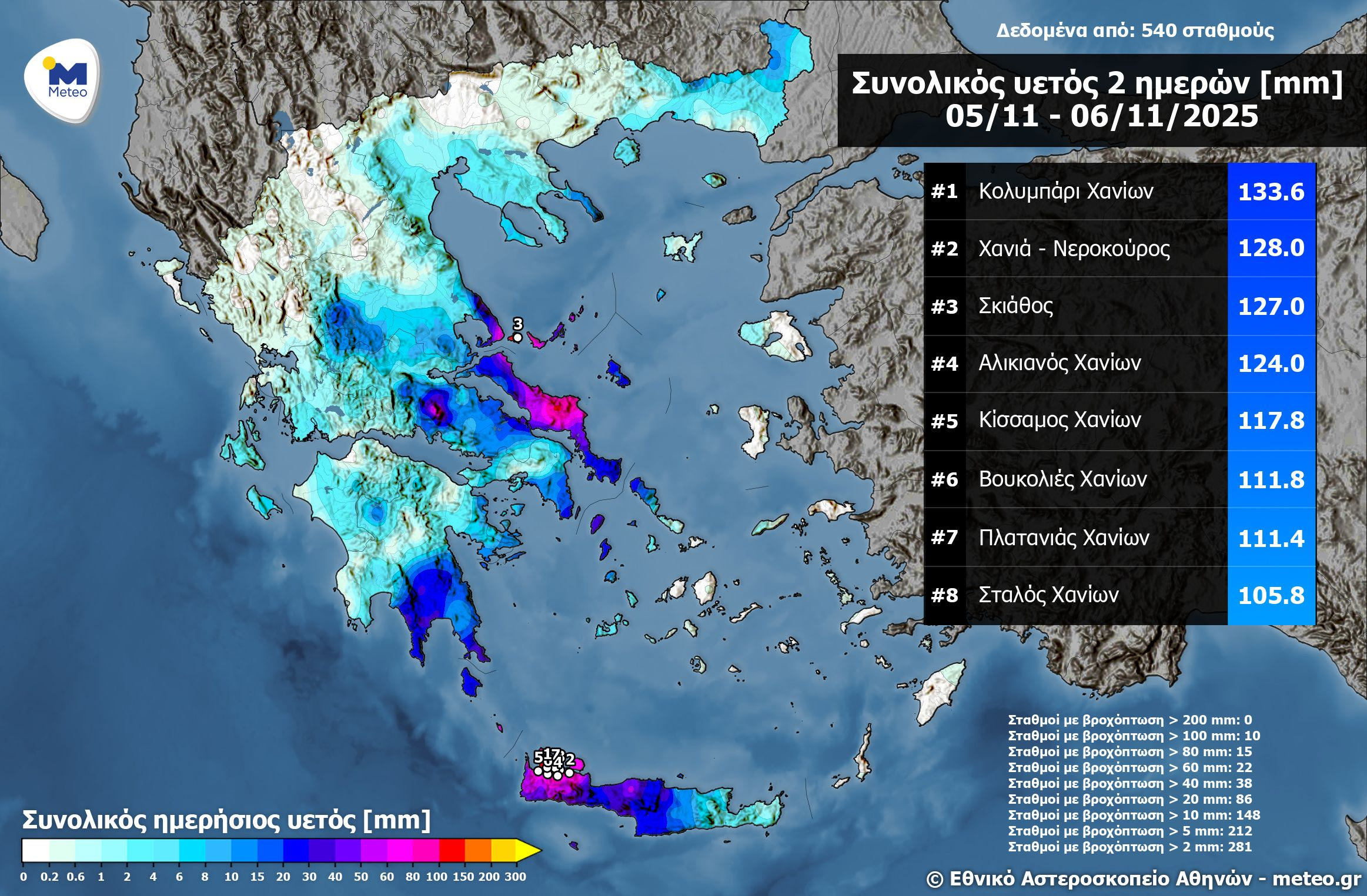 Αξιόλογα ύψη βροχής καταγράφηκαν κατά τόπους το διήμερο 5 και 6 Νοεμβρίου 2025 κυρίως στα νότια και ανατολικά τμήματα της χώρας.