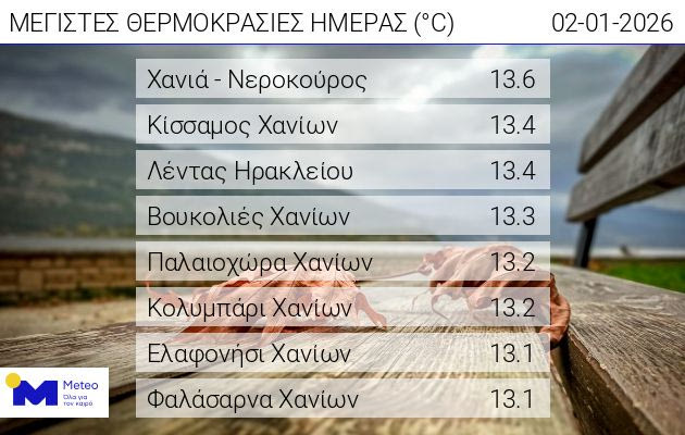 Ακολουθεί η Κίσσαμος με 13.4 και ο Λέντας Ηρακλείου, οι Βουκολιές με 13.3, η Παλαιόχωρα και το Κολυμπάρι με 13.2, το Ελαφονήσι και τα Φαλάσαρνα με 13.1 βαθμούς Κελσίου.