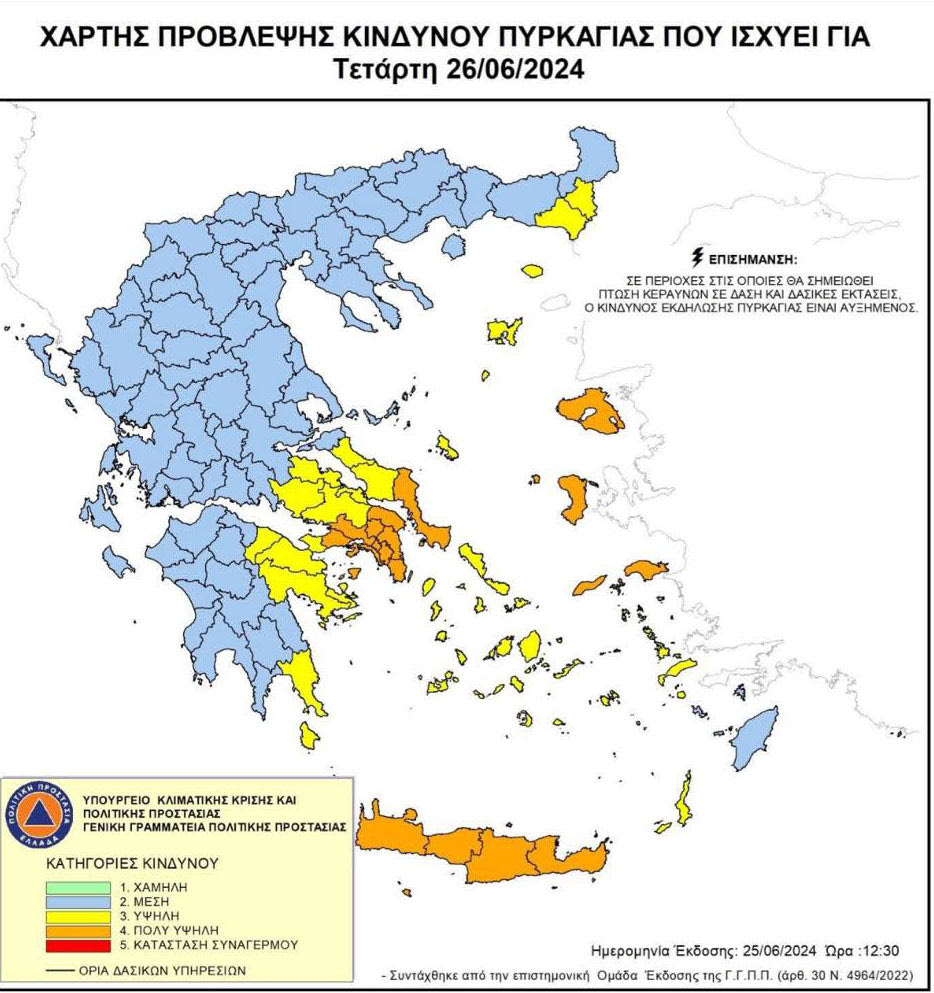 Σύμφωνα με το δελτίο πρόβλεψης κινδύνου πυρκαγιάς που ισχύει για σήμερα Τετάρτη, η πιθανότητα εκδήλωσης πυρκαγιάς στην Κρήτη θεωρείται πολύ υψηλή (Βαθμός επικινδυνότητας 4) και ως εκ τούτου οι πολίτες παρακαλούνται να λάβουν όλα τα ενδεικνυόμενα μέτρα επιφυλακής και ετοιμότητας.