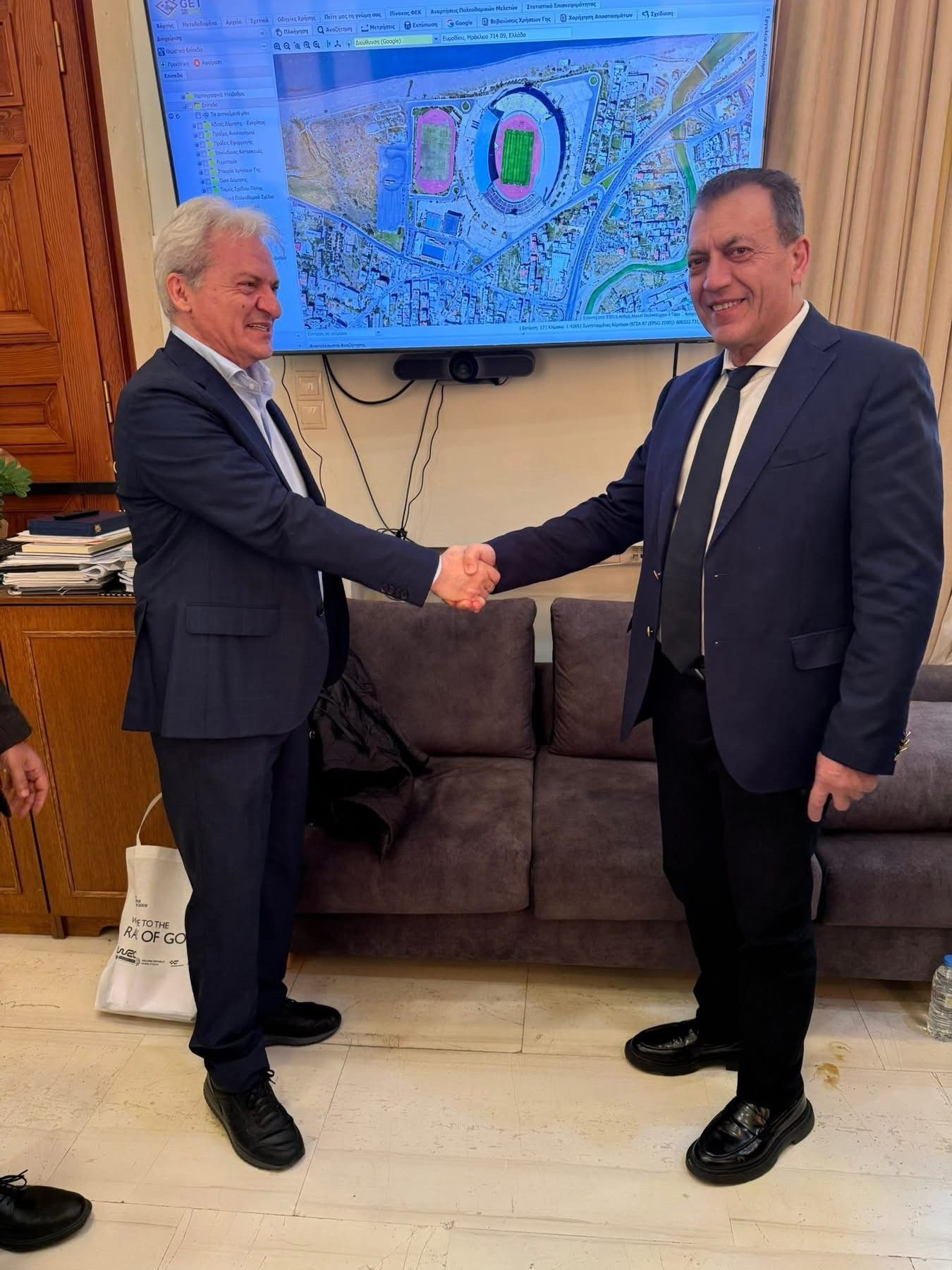 Για τα αθλητικά έργα που θα πραγματοποιηθούν στο Ηράκλειο, είχαν την ευκαιρία να συζητήσουν ο Αναπληρωτής Υπουργός Πολιτισμού αρμόδιος για θέματα Αθλητισμού Γιάννης Βρούτσης με τον πρόεδρο της ΔΕΕΠ Ηρακλείου Κώστα Γιαννουλάκη, κατά την διάρκεια της επίσκεψης στο δήμο Ηρακλείου και στην Περιφέρεια Κρήτης.